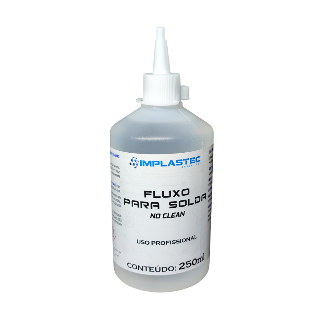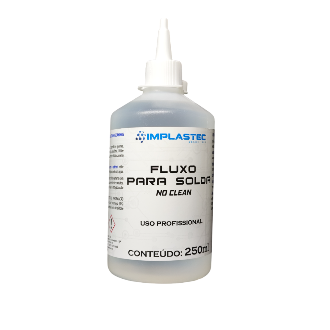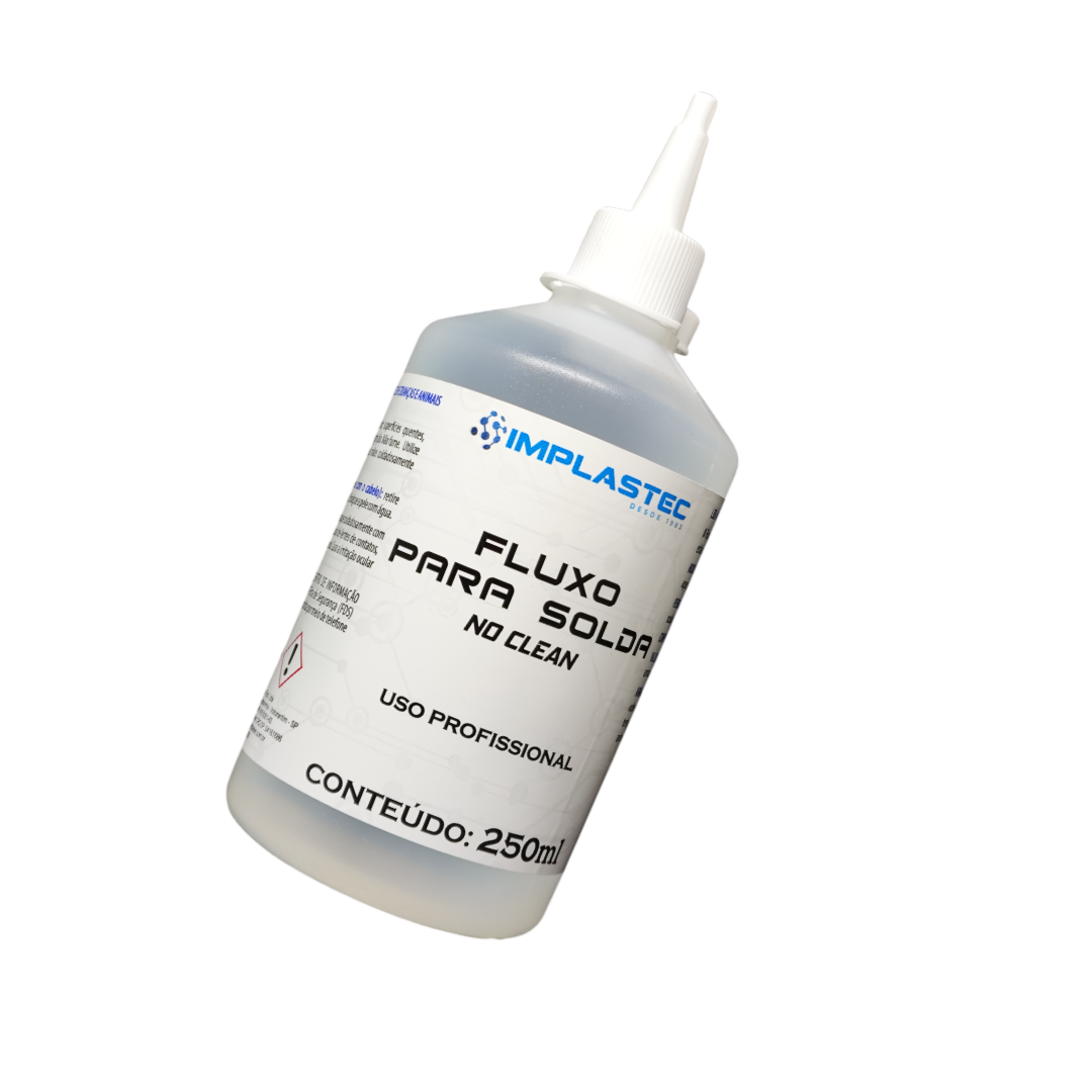 O fluxo de solda ou fluxo de soldagem é um produto essencial no processo de soldagem eletrônica, utilizado para remover óxidos, oxidações e impurezas da superfície da placa e terminal do componente eletrônico a ser soldado, garantindo uma conexão mais eficiente. O Fluxo para solda melhora a aderência do estanho líquido, ou solda liquida, ao metal base da placa eletrônica, tornando a soldagem mais limpa e eficaz. O fluxo de solda líquido é especialmente útil para garantir que o estanho flua melhor e se espalhe corretamente, gerando uma solda perfeita com excelente condutividade elétrica e resistência mecânica. Para alguns tipos de soldagem, o fluxo para soldagem é uma escolha essencial para uma boa aderência. Além disso, o fluxo para solda pode ser utilizado em diversas aplicações, como em soldagem de estanho líquido, em placas eletrônicas que possuem ilhas de solda metalizas ou não.